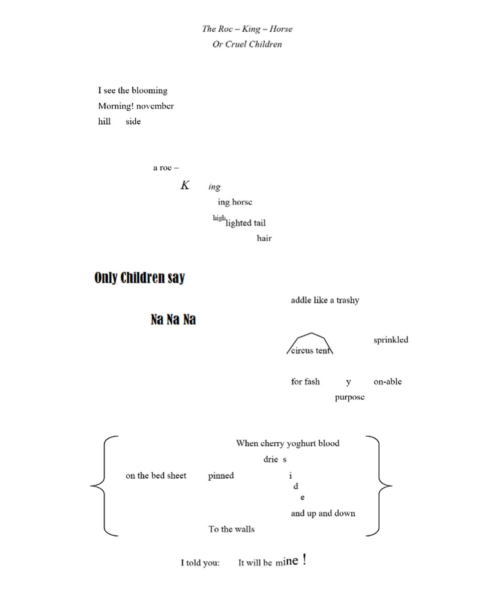 For example, artists might erase or copy words. It’s also very popular to replace and repeat words to create a certain “stuttering” effect. You can see this done very subtly in some of my favourite poet’s works, Susan Howe.