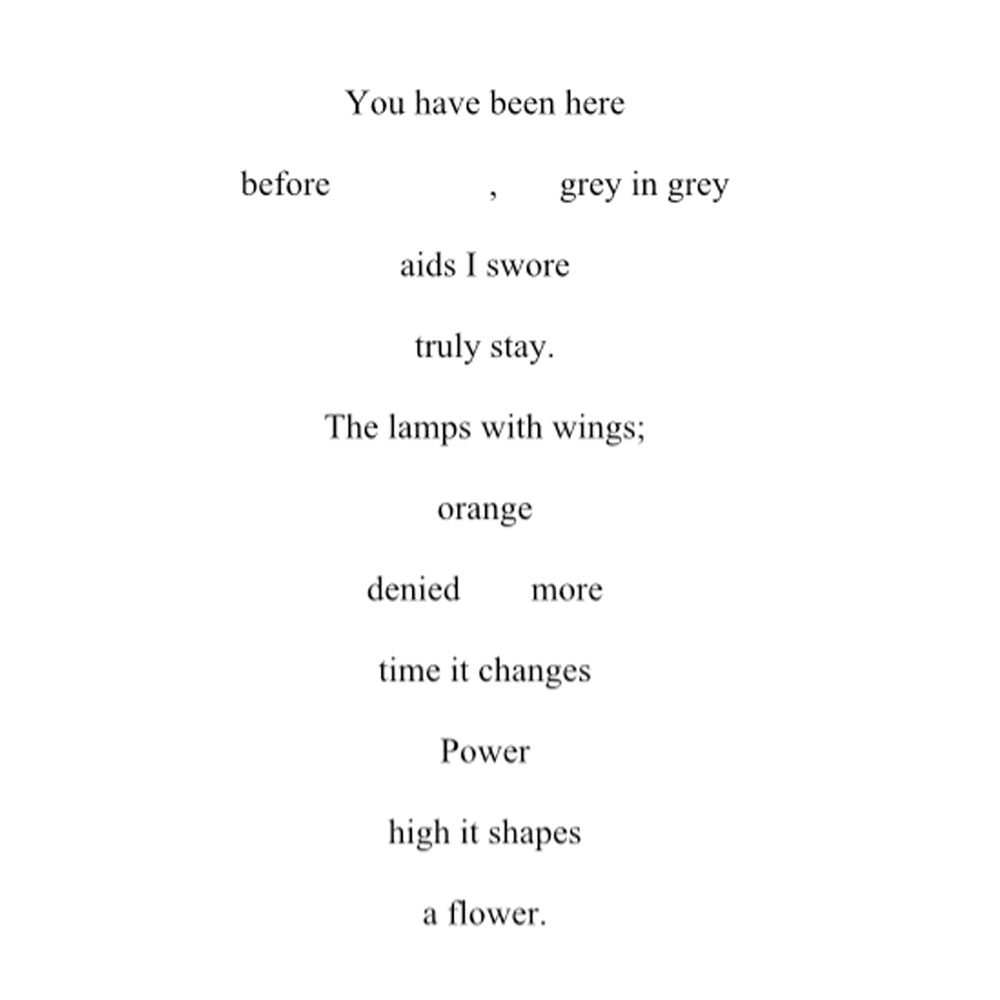 For example, artists might erase or copy words. It’s also very popular to replace and repeat words to create a certain “stuttering” effect. You can see this done very subtly in some of my favourite poet’s works, Susan Howe.